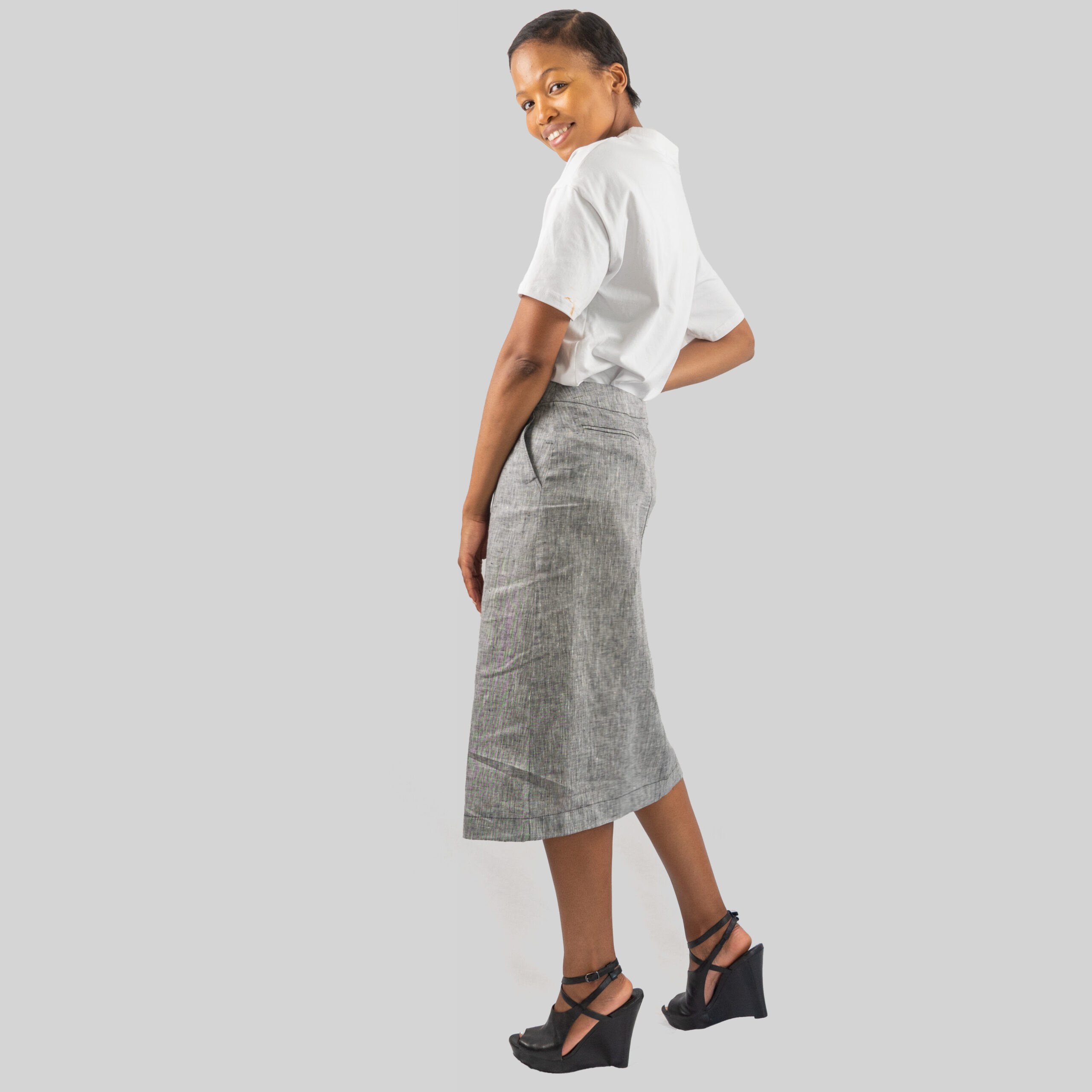 Pair with a Crisp White Cotton Top.  Embrace elegance by combining the Grey Linen Pencil Skirt with a cropped, stylish white cotton top. This clean and sophisticated ensemble exudes confidence while making it perfect for both professional and social settings.